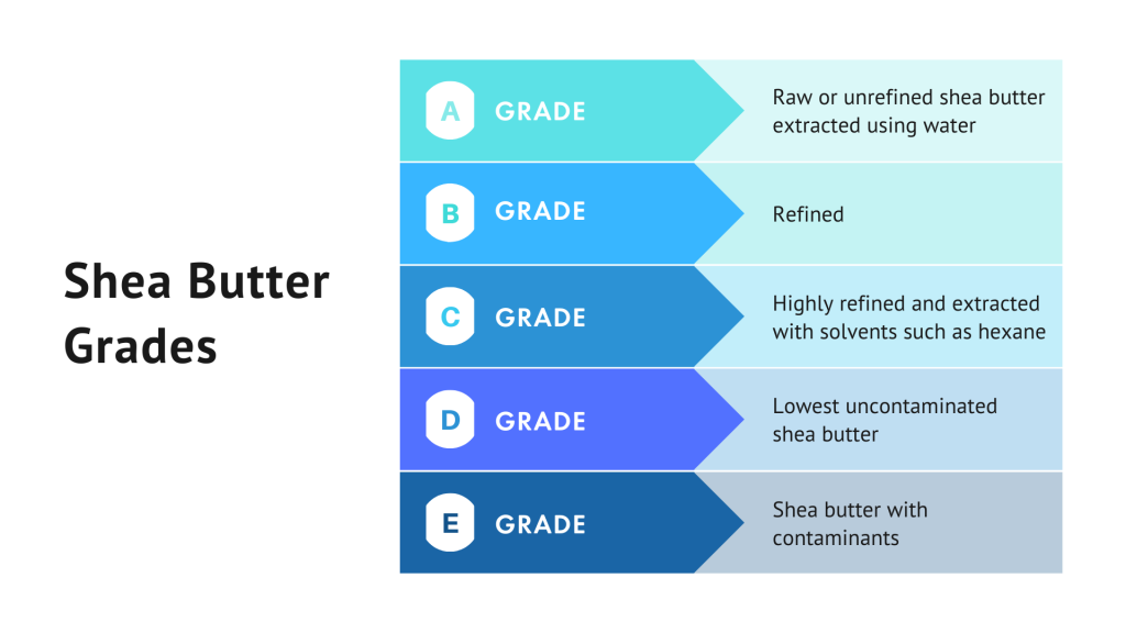 Shea Butter Grades Several organizations including the United States Agency for International Development (USAID) and the major end-users of shea butter have suggested the following classification system for shea butter, into five different grades based on its method of extraction and quality parameters.