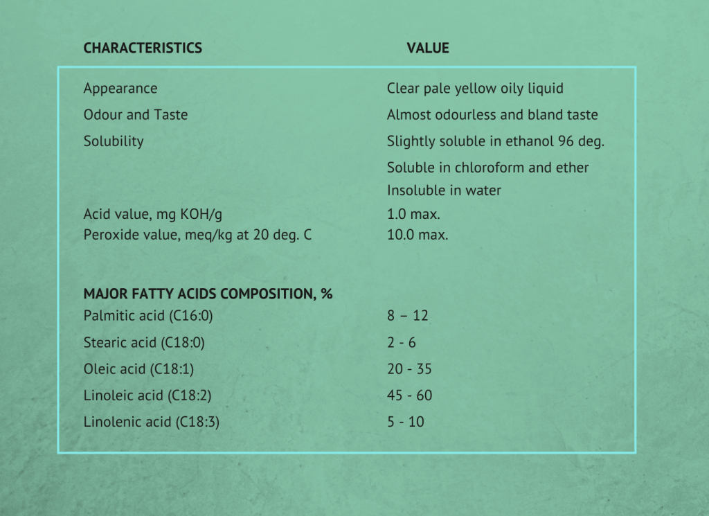 Typical specification for refined soybean oil and its major fatty acids composition are presented in the following Table